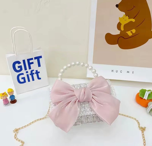 Bolso peludo de cinnamon roll blanco con detalle de moñito celeste a cuadros