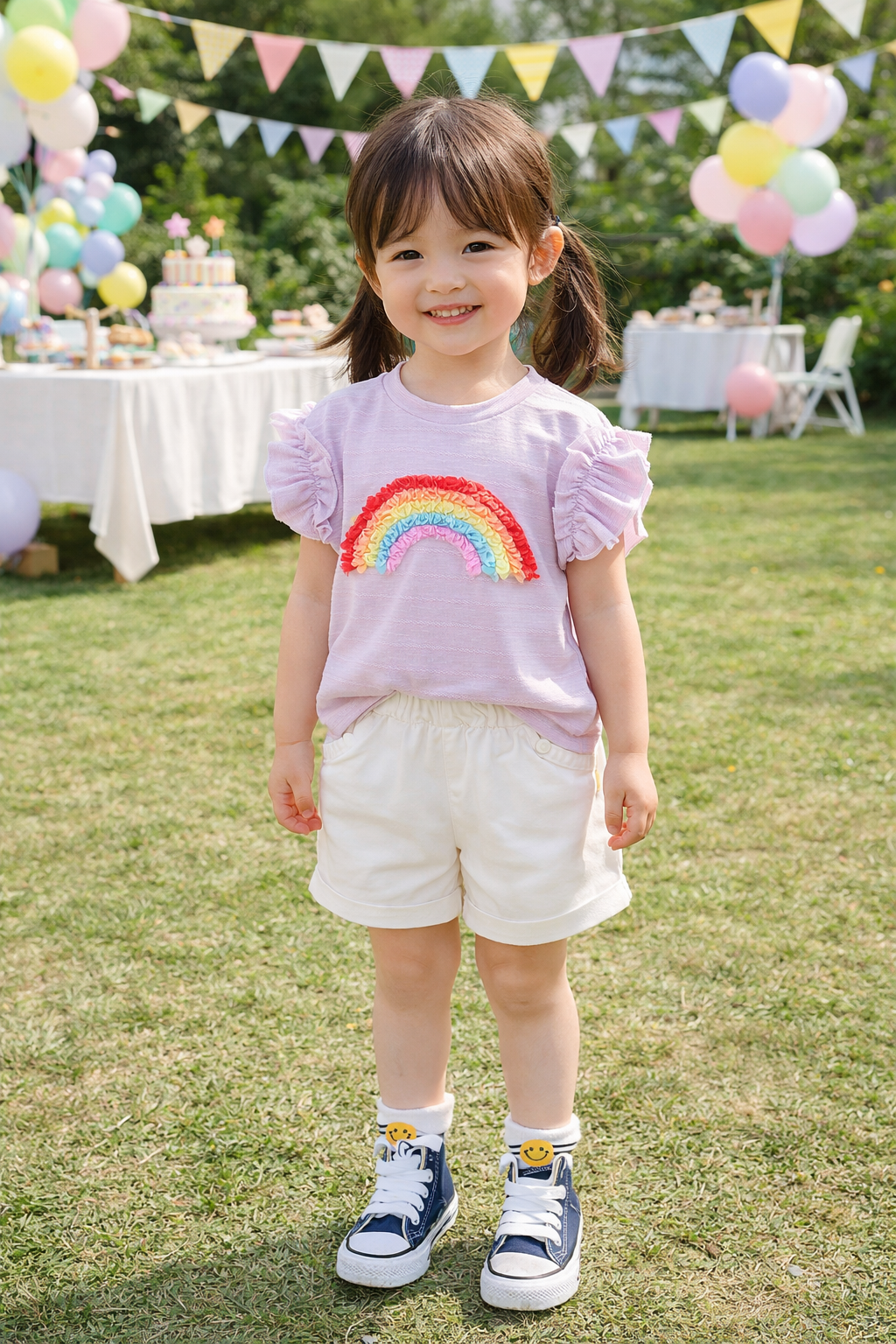 Conjunto short de jeans con remera lila detalle de arcoíris