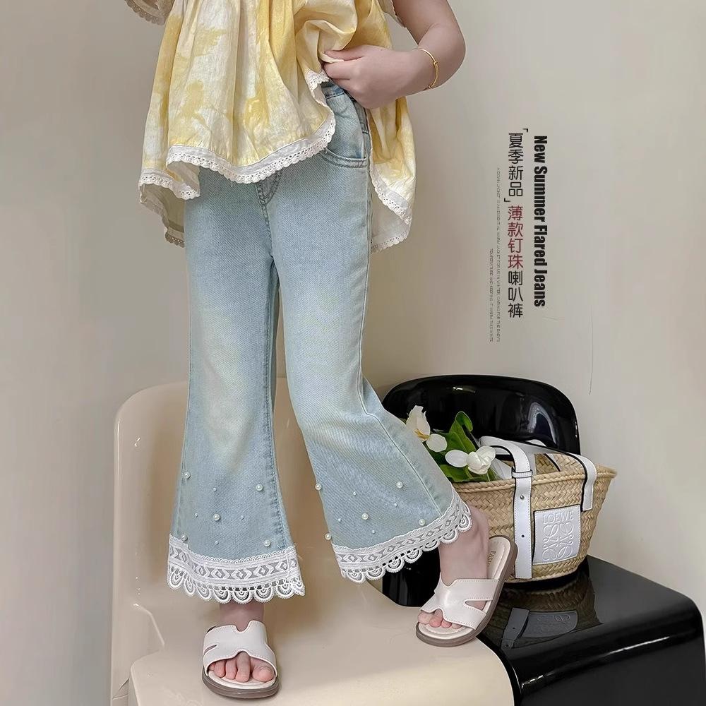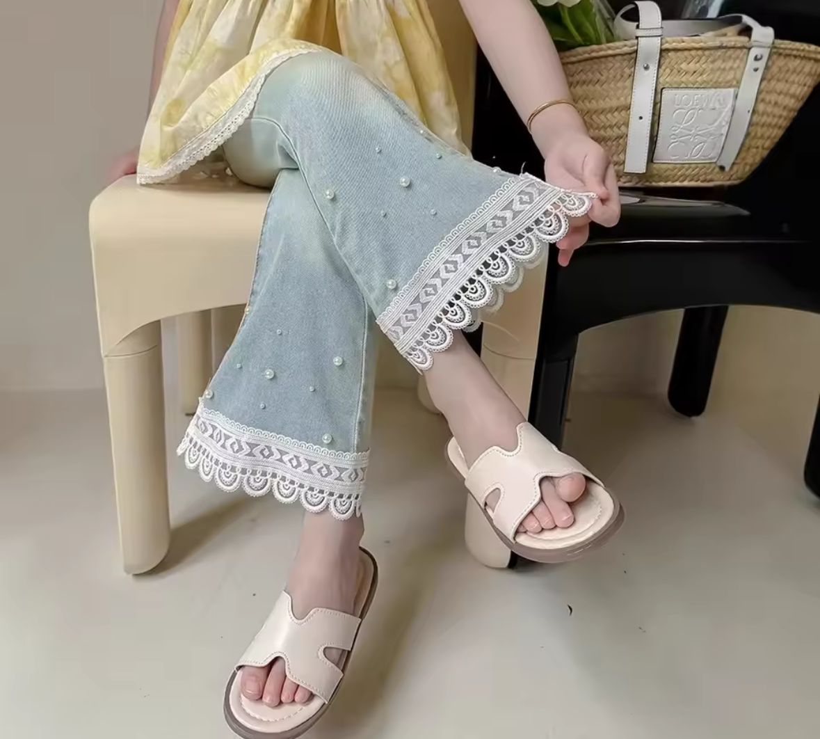 Pantalón de jeans tipo Oxford detalle de perlas y bordado