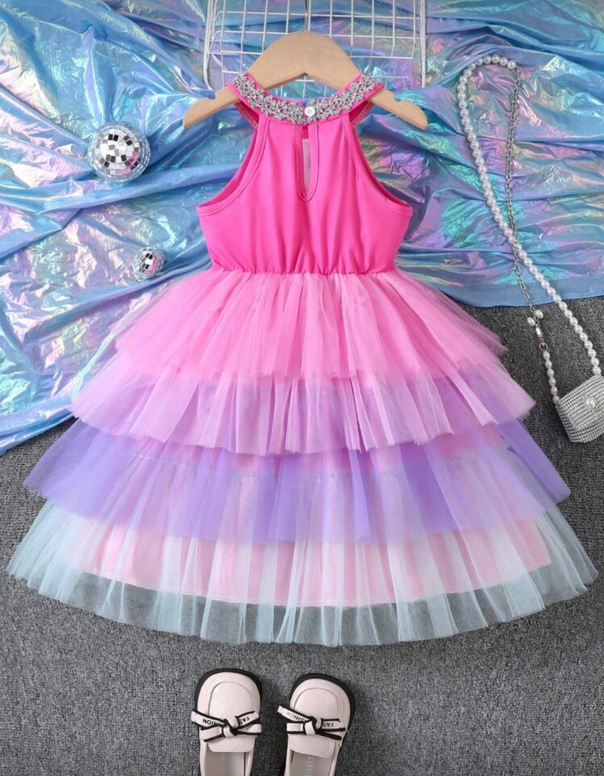 Vestido fucsia con detalle de capas coloridas
